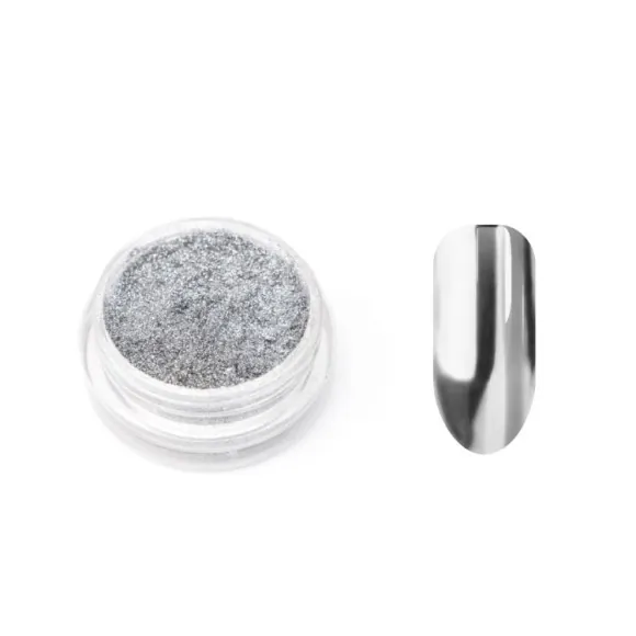Мелкодисперсионная пыль со светоотражающим эффектом придает покрытию яркий металлический блеск. Нанести гель-лак по технологии, используя топ без липкого слоя, просушить в лампе. Нанести средство на поверхность ногтя втирающими движениями при помощи спонжа. Готовый дизайн перекрыть топом и заполимеризовать.